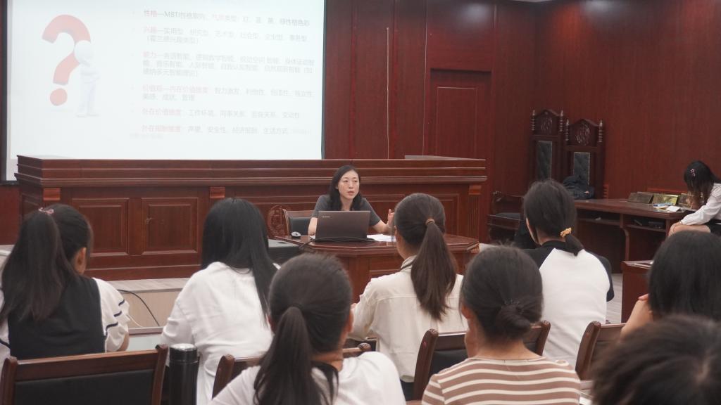 9月19日下午,法学院2023级新生入学教育系列活动之就业指导与生涯规划讲座在燕山校区模拟法庭举行,讲座由学院就业办郭蕾老师主讲。