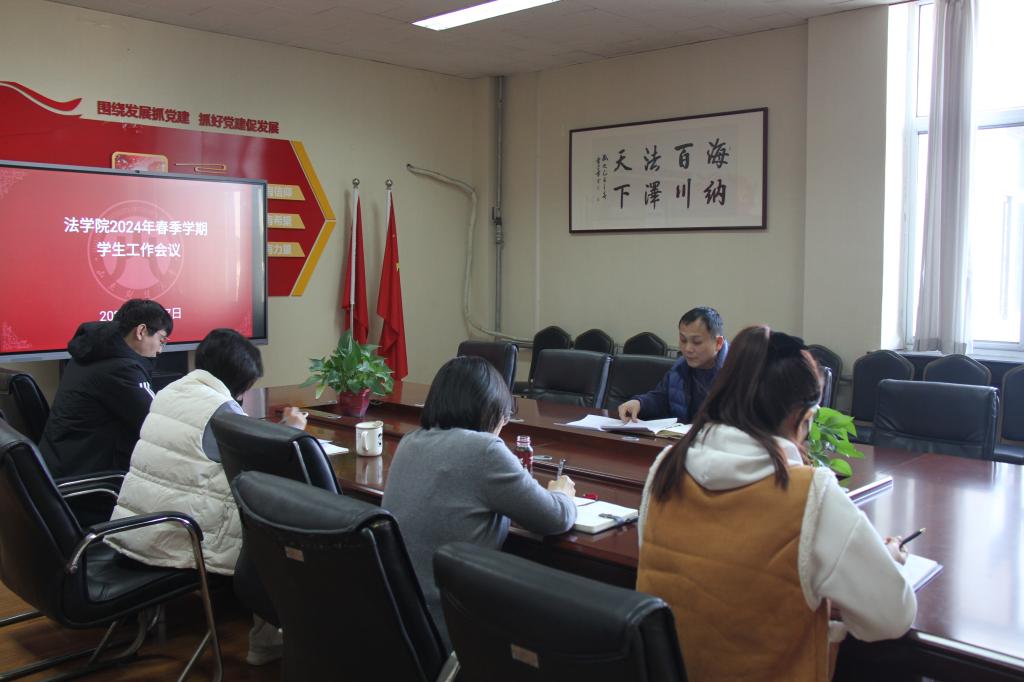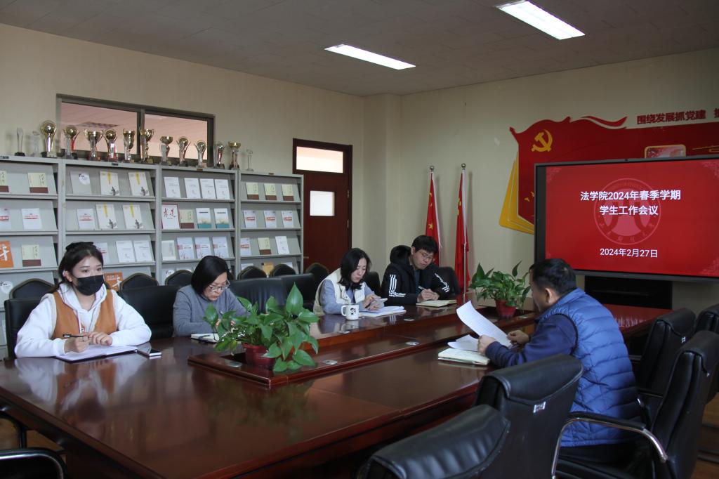 为扎实推进新学期各项工作顺利进行,2月27日下午在燕山校区4508会议室,法学院召开2024年春季学期学生工作会议。学院党委副书记沙林斌、团委书记赵金鹏、辅导员郭蕾、刘晓莉、杨玉霜参加了本次会议。会议由沙林斌主持。
