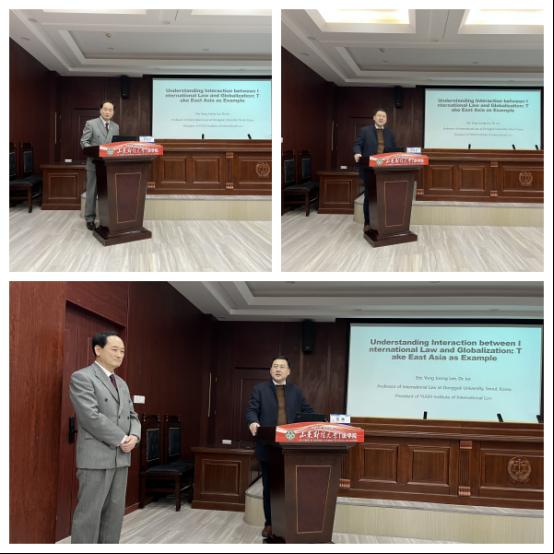 12月9日,韩国东国大学国际法教授、李㒞国际法研究院院长、上海对外经贸大学世界贸易组织研究院讲席教授李庸中来山东财经大学法学院做专题讲座,讲座题目是“Understanding Interaction between International Law and Globalization: Take East Asia as Example”。法学院学术院长张琳,副院长纪建文、王莉莉,法学院部分在校研究生和本科生参加讲座。