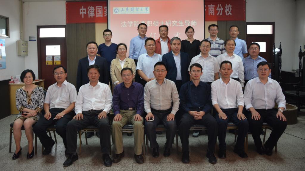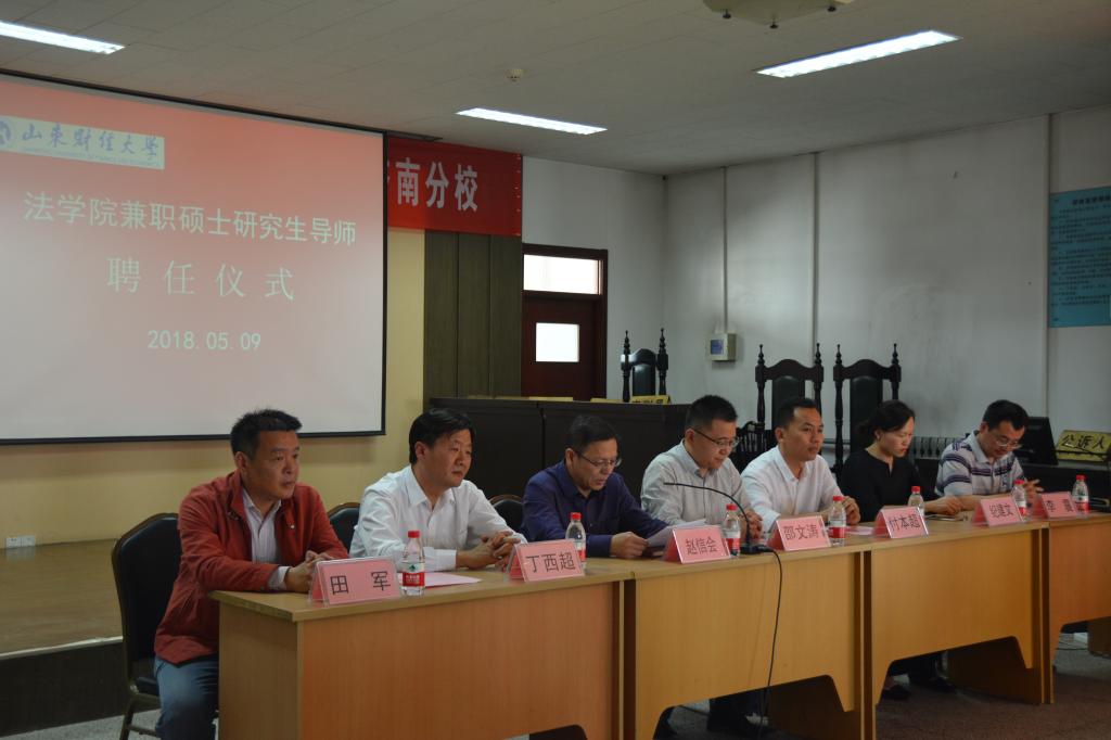 2018年5月9日下午,山东财经大学法学院兼职硕士研究生导师聘任仪式在山东财经大学(燕山校区)四号楼模拟法庭举行。法学院党委书记邵文涛,院长、党委副书记赵信会教授,党委副书记田军,副院长纪建文教授出席,到场的还有受聘的兼职导师和法学院在读研究生代表。聘任仪式由李震副院长主持。