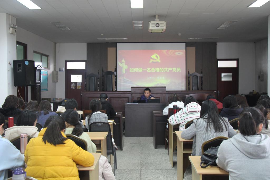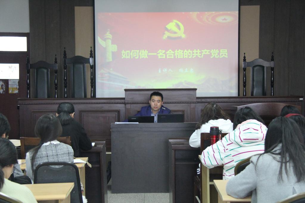 4月11日下午,法学院邀请学校党委组织部副处级组织员杨立忠在燕山校区模拟法庭室以“如何做一名合格的共产党员”为主题,为全体新党员、入党积极分子上了一堂精彩的党课。法学院党委副书记危红主持党课。