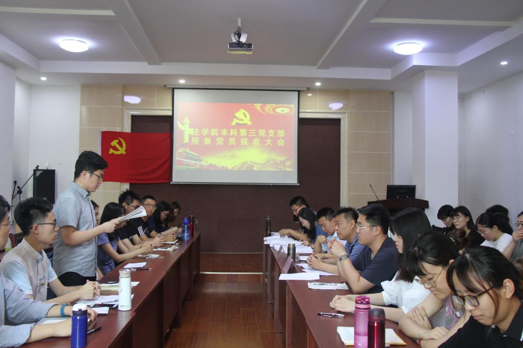 为进一步推进发展党员工作的科学化、规范化和制度化建设,不断提高发展党员工作的质量,保持党的先进性和纯洁性。2019年7月5日午,法学院本科第三党支部召开预备党员支部纳新大会,本科第三党支部和本批党员发展对象参加了此次大会。校党委组织部副处级组织员杨立忠,院党委书记邵文涛,院党委副书记田军列席此次会议,会议由本科第三党支部书记郭蕾主持。