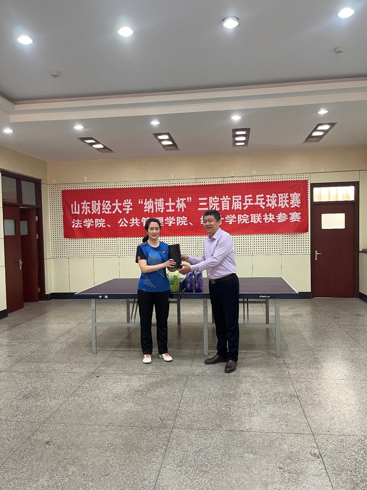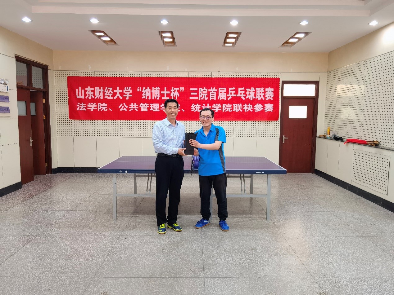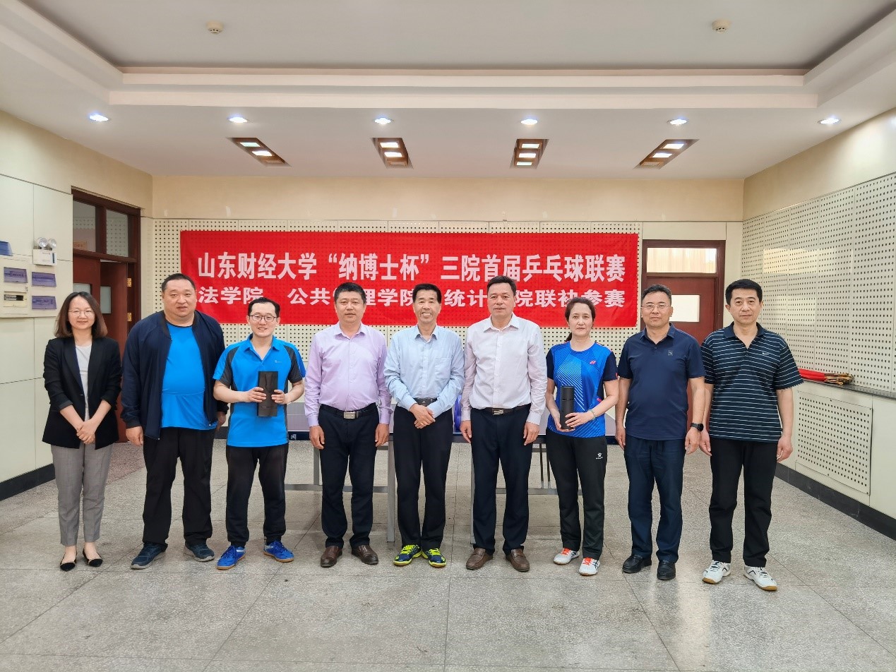 经过多日的精心筹备,山东财经大学“纳博士杯”法学院、公共管理学院、统计学院三院首届乒乓球联赛决赛于5月6日下午在燕山校区四号楼四楼乒乓球活动室正式拉开帷幕,校党委委员、纪委书记、省监委驻山东财经大学监察专员姜波,“纳博士”公司董事长王汉领、法学院党委书记赵世民,统计学院党委书记郑磊以及学院老师出席并观看了此次比赛。
