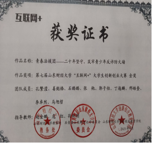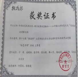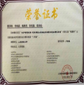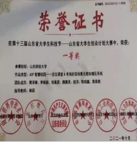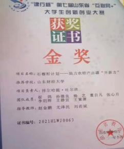 李姝颖等获山东省大学生创业计划大赛一等奖、2021年第五届“鲲鹏杯”山东新动能软件创新创业大赛二等奖;赵晓晓等获第十七届“挑战杯”山东财经大学大学生课外学术科技作品竞赛“红色专项”活动二等奖。
