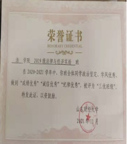 法律与经济实验班英语四级通过率达到100%,英语六级通过率56%以上。大一大二学年的平均学习成绩为87.31,连续四个学期无不及格现象。班级先后获得2019年校优秀班集体、2020年校“三优班级”、2021校“三优班级”、2021年校“星火传承”五星团支部等荣誉称号。