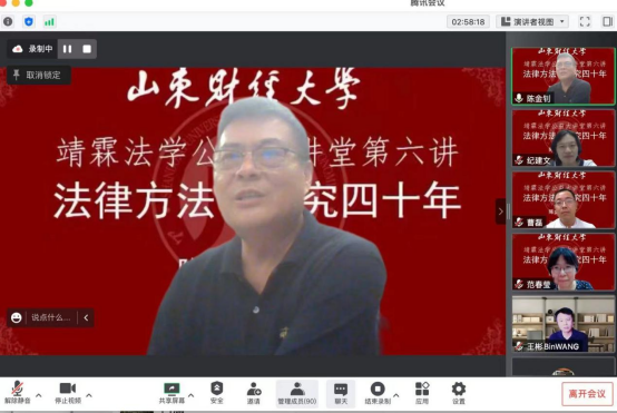 为庆祝山东财经大学建校70周年暨合并建校10周年,促进学术交流,法学院、科研处联袂于2022年6月2日邀请华东政法大学科学研究院院长、法律方法论专业博士生导师陈金钊教授作了题为《法律方法论研究四十年》的精彩讲座。本次讲座也是山东财经大学靖霖法学公益大讲堂的第六讲,由浙江靖霖(济南)律师事务所协助承办。讲座采用线上、线下相结合的方式,法学院党委书记危红、副院长纪建文、副教授范春莹、讲师刘岩、济南市中级人民法院法官曹磊、部分研究生及其他高校和实务界同仁共二百余人参与本次讲座,讲座由纪建文教授主持。