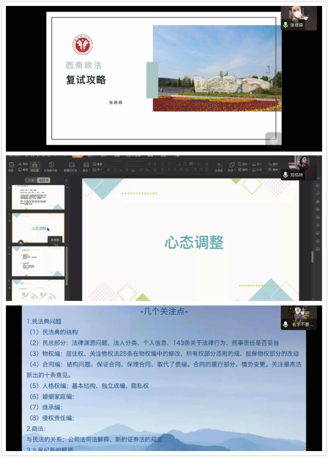 刘栋林、田野和张继森三位校友先后结合自己的考研复试经历,分享了自己成功考取山东大学、中国政法大学和西南政法大学的经验,从考试内容的准备到心态的调整,涉及到了考研复试的方方面面。并着重在复试的准备、面试的注意事项和考试政策这几个方面同大家进行交流分析。最后,郭蕾老师和三位校友一起耐心地回答了同学们提出的问题,解答同学们的疑问。