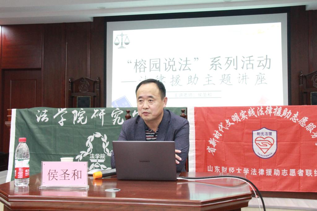 为进一步增强同学们对法律援助的认识和了解,普及《法律援助法》的基本精神与核心要旨,山东财经大学大学生法律援助中心与法学院研究生会联合举办了“榕园说法”活动,邀请法学院侯圣和老师在四号楼模拟法庭举行了以法律援助为主要内容的专题讲座。