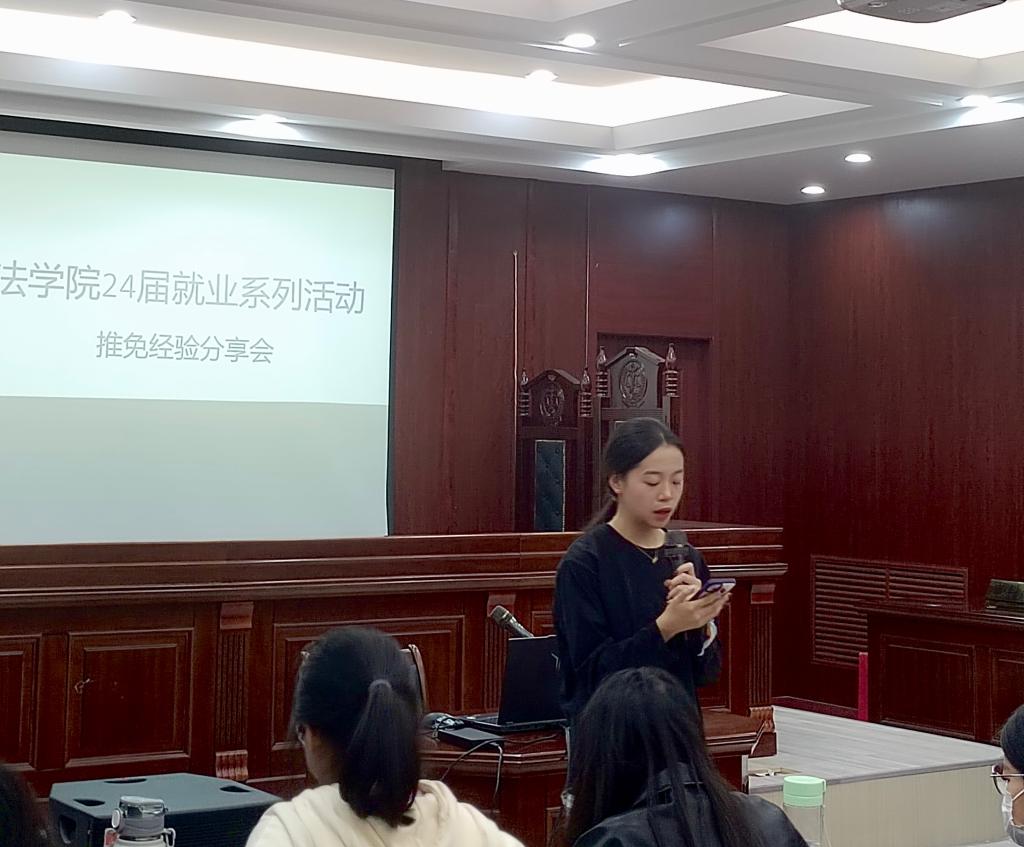 为帮助我院准备争取推荐免试研究生资格的同学了解相关政策、更好地备战,10月27日晚,法学院在模拟法庭举行了本年度推免经验交流会。学院邀请24届已经顺利推免成功的王文清、刘润苗、曾杨怡、王菁彧、石璐璐、刘家欣、宋欣茹、朱孟影八位同学围绕研支团、推免政策、相关院校信息以及她们各自总结的经验为低年级的同学进行了分享。