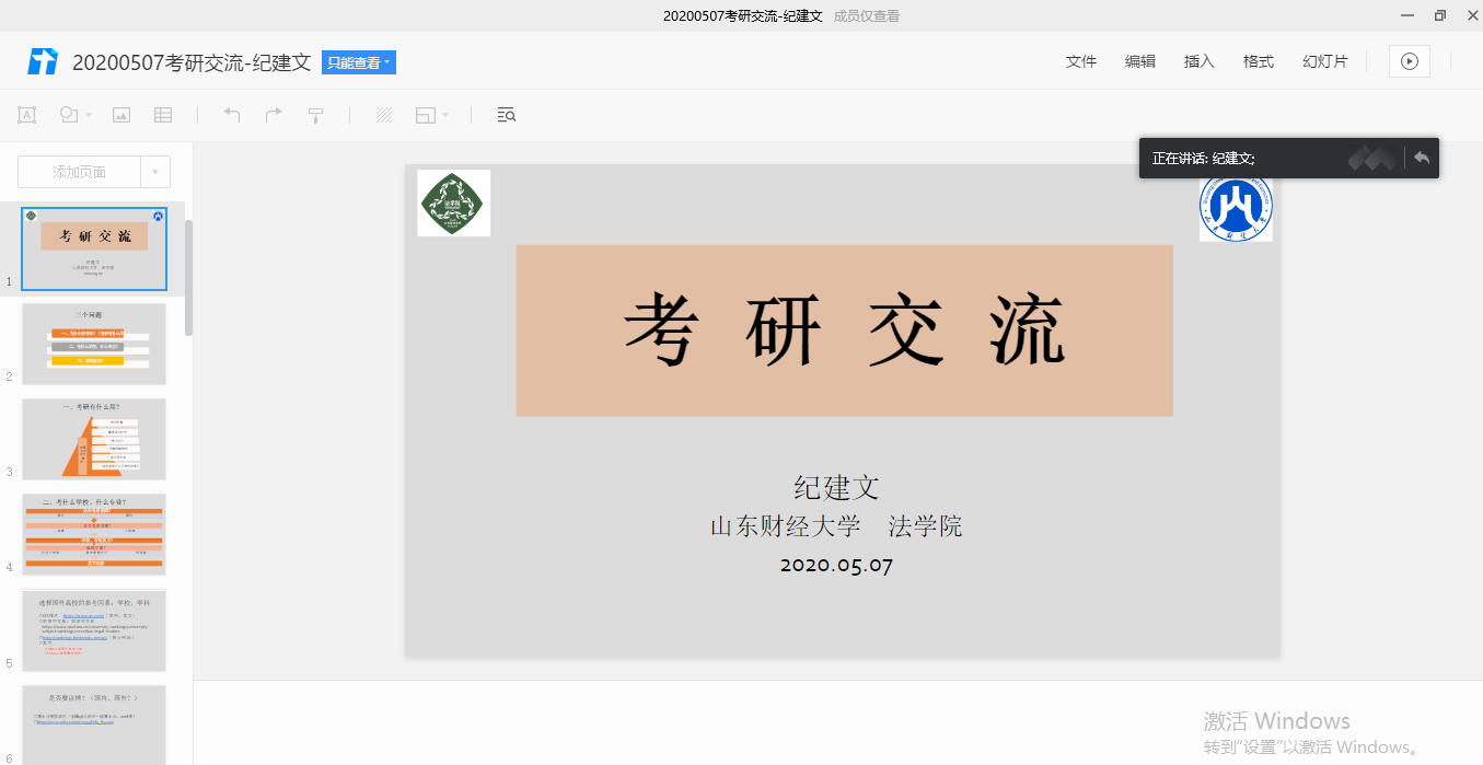 为帮助同学们更好地制定考研计划,明确学习目标。5月7日晚,法学院借助网络平台举办考研交流会。本次交流活动邀请法学院副院长纪建文针对同学们考研中遇到的问题进行交流。交流会由法学院党委副书记危红主持, 法学院100余名同学参与了本次线上活动。