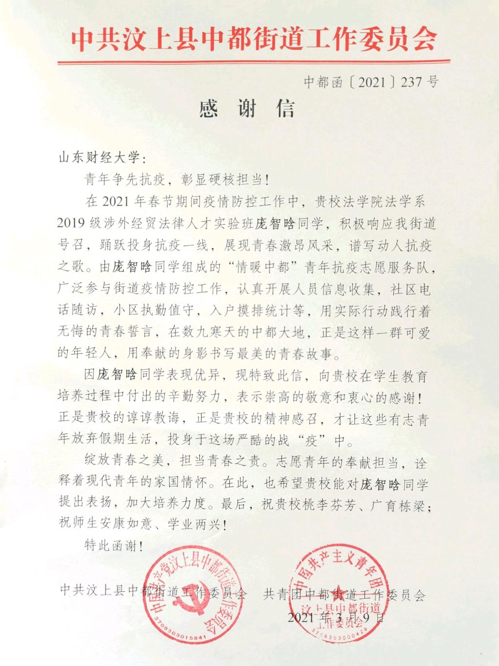 沧海横流显本色,危难时刻见初心,近日,我院收到来自中共汶上县中都街道工作委员会的一封感谢信,对疫情期间奋斗在一线的抗疫青年志愿者庞智晗同学进行了表扬,对其在抗击疫情的紧要关头,积极响应号召,主动投身疫情防疫一线,充分发扬志愿服务精神及认真负责的工作态度给予了高度肯定,同时对学校的人才培养工作表示感谢。