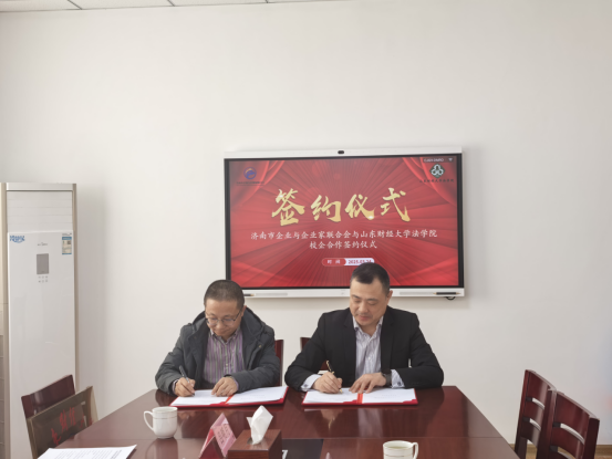 3月24日上午,济南市企业与企业家联合会与山东财经大学法学院校企合作协议签约与社会实践基地揭牌仪式在济南企联会议室举行。山东财经大学法学院副院长王仰光,院长助理李同武,社会工作系主任、社工专硕教育中心主任董云芳,社会工作系教师吕明月,济南市企业与企业家联合会秘书长张锐,会员发展部主任董瑶及秘书处杨作昊,出席了签约揭牌仪式并参加座谈交流。双方将在党建共建、ESG研究院、实习实训基地建设、实务课程开发教学、科研项目合作等方面开展全方位、多层次的合作,以实现资源共享、优势互补、互利共赢。
