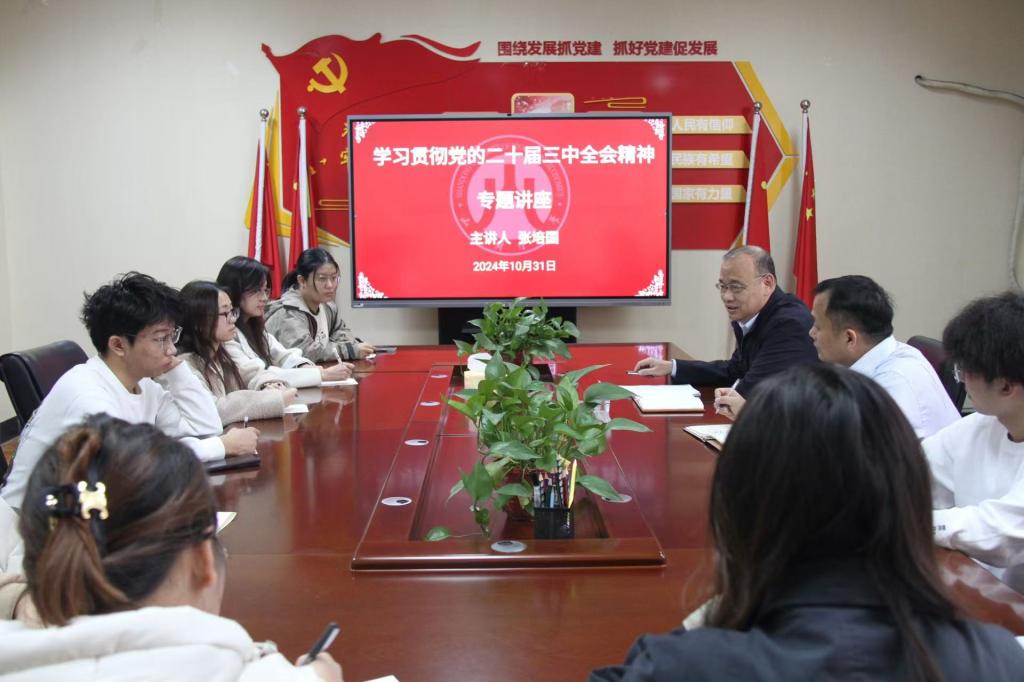 10月31日,学校宣讲团成员、校党委副书记张培国到法学院为2023级涉外经贸法律人才实验班的学生宣讲党的二十届三中全会精神。宣讲会在燕山校区4508会议室举行,法学院党委副书记沙林斌主持。