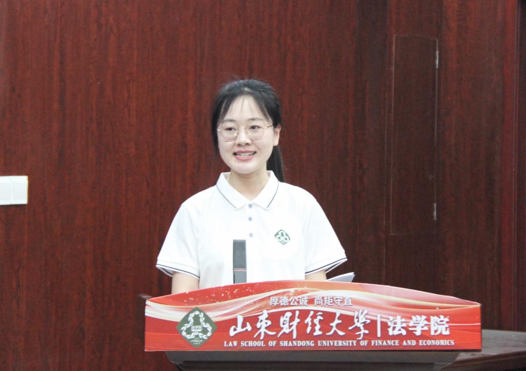 实习学生代表,法学院2022级涉外经贸法律人才实验班郑海霞发言。她代表实习同学感谢学院提供的宝贵实习机会,并表示大家将在后续实习中积极展现良好的精神风貌和专业能力