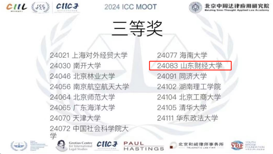 2024年4月13日至4月14日,2024年国际刑事法院模拟法庭比赛(中文赛)正赛于北京香山饭店举办。本次比赛中,全国共118支高校队伍参与其中。山东财经大学法学院代表队书状比拼环节后与其他45支代表队共同晋级正赛。在分别进行过三次精彩的庭辩之后,我院代表队与清华大学、南开大学、同济大学、华东政法大学等高校同获全国三等奖。