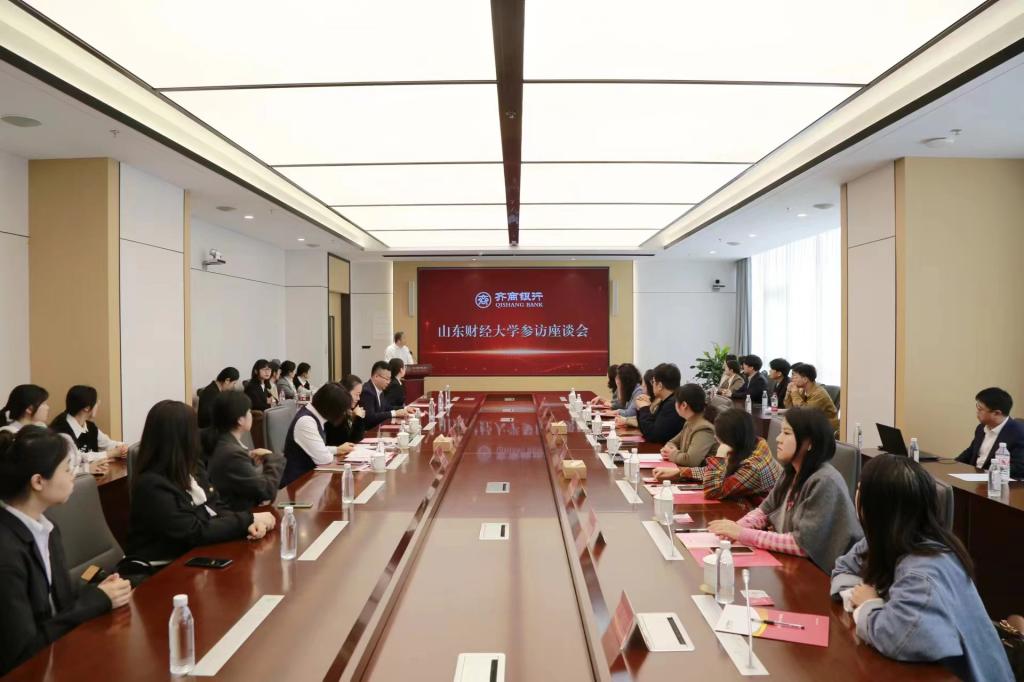 之后的座谈会上,集体观看了齐商银行26周年宣传片,马总经理对银行的基本情况、发展愿景、用人用工、晋升机制等方面进行了介绍,帮助与会师生进一步了解齐商、走进齐商。在互动交流环节中,我院毕业生积极提问,就银行的培训育人机制、薪资待遇和团建活动等问题向各位领导请教,领导们均细致解答。马慧玲主席向参访师生的到来表示热烈的欢迎,并殷切期盼我院学生早日加入齐商大家庭。