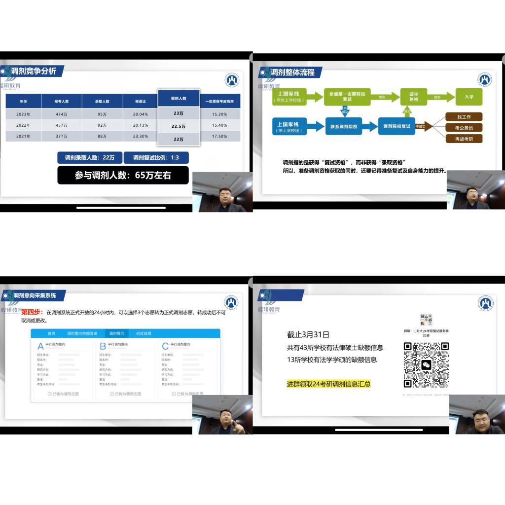黄军杰是山东财经大学校友就业导师、峰研教育首席规划师,有着十余年的考研规划指导经验。黄军杰首先对今年的考研难度和复试调剂形式进行了分析,主要围绕调剂的政策、调剂的注意事项、调剂平台、调剂具体操作等方面进行详细讲解。