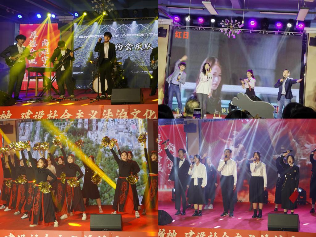 晚会第二篇章:履践致远,奋楫笃行。学院未央艺术团带来的作品《锦鲤抄》将轻盈的舞姿与悠扬的歌声结合,勾勒出一幅古香古色的优雅绘图;舞蹈《生命力》展现了法学学子的青春活力;大学生法律援助中心带来的小品节目《法援在行动》,以生动新颖的方式、幽默诙谐的表演,警示大家要增强反诈意识,维护法律的权威;2023年山东省“学宪法、讲宪法”一等奖获得者郑海霞同学带来朗诵《追寻宪法根基,守护人民福祉》表达了法学学子弘扬宪法精神,坚定法治信仰的决心。