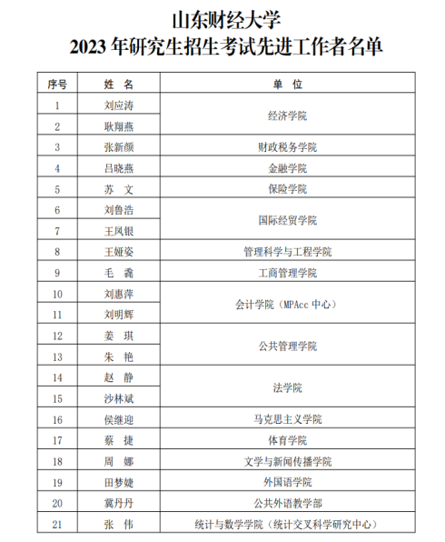 为弘扬争先创优的良好风气,进一步推动研究生招生考试工作高质量发展,学校对在2023年研究生招生考试工作中做出突出贡献的先进单位和先进工作者进行了表彰,我院被评为山东财经大学2023年研究生招生考试先进单位,并且我院赵静和沙林斌两位老师获得了山东财经大学2023年研究生招生考试先进工作者的荣誉称号。法学院及以赵静、沙林斌两位老师为代表的教职工对学校2023年研究生招生考试工作做出了突出的贡献,法学院及赵静、沙林斌老师获得学校表彰,是学校对法学院研究生招考工作的充分肯定,同时也激励法学院在学校党委的坚强领导下继续保持优良的工作作风,争取在学校高质量发展的进程中取得更大成绩。