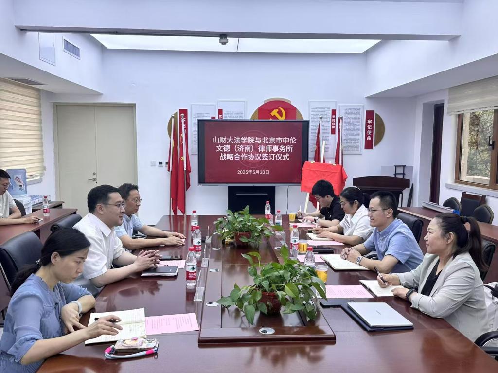 2025年5月30日,北京市中伦文德(济南)律师事务所与山东财经大学法学院在学院会议室举行战略合作协议签约及社会实践基地揭牌仪式。山东财经大学法学院院长张琳、院长助理李同武、办公室主任赵晗以及中伦文德济南所主任付春法、行政主管王乐梅、合伙人康玉冰等出席了本次仪式。