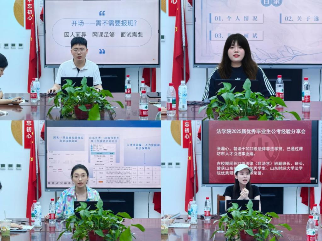 随后,四位毕业生结合亲身经历,为学弟学妹们呈现了清晰的备考思路与丰富的实战经验:2023级法律法学班韩宝杰结合自己成功考取章丘区检察院的经验,聚焦山东省考全流程,深入解析备考规划、高效学习方法与精准选岗策略。2023级法律法学班袁烁,系统分享了拔尖选调生全流程备考及面试实战经验,强调了提前完成毕业论文初稿以预留充分时间备考的策略。2023级法律法学班杨业华,现已成功考入北京出入境边防总站,她在分享会上解析了特殊岗位招录特点与职业发展前景,强调了体能测试与心理素质考核的重要性。2022级法律非法学班张瀚心,通过潍坊市人才引进项目进入事业编岗位,她向大家详细解读了潍坊市人才引进政策的申请条件与流程,讲解了高层次人才引进的备考策略。