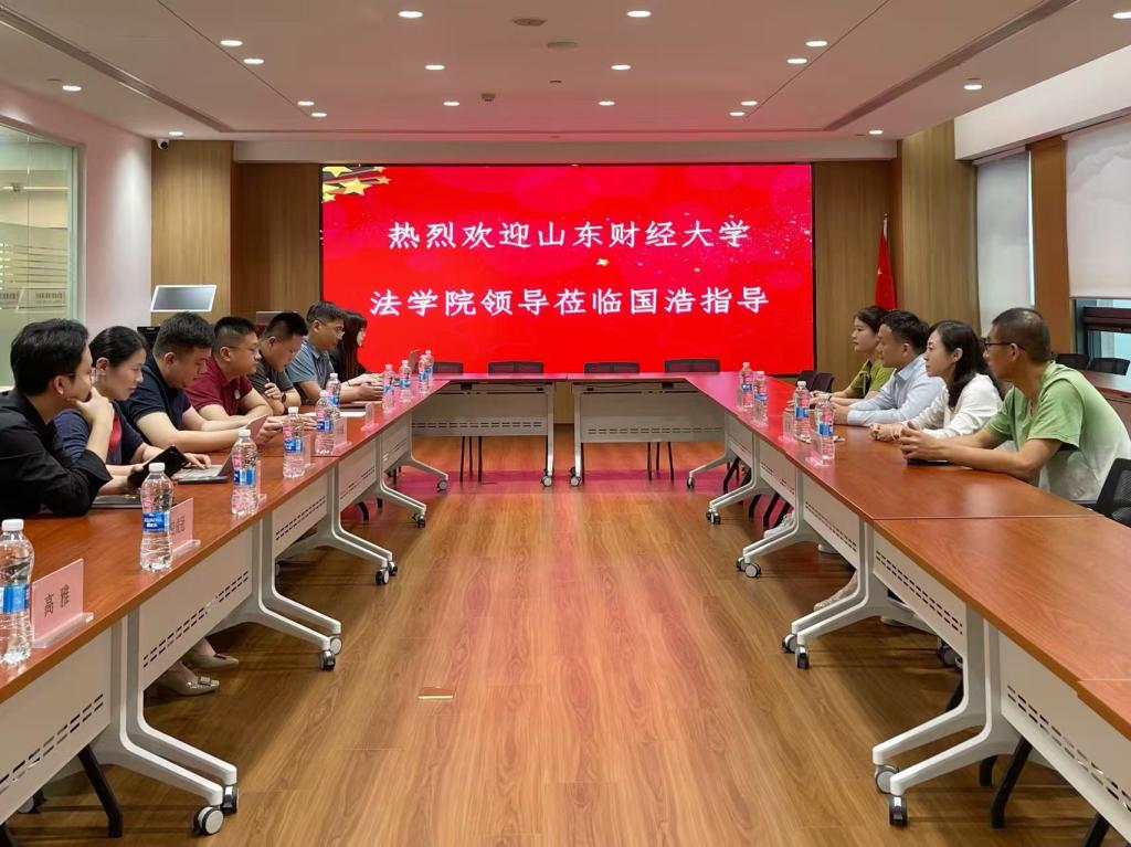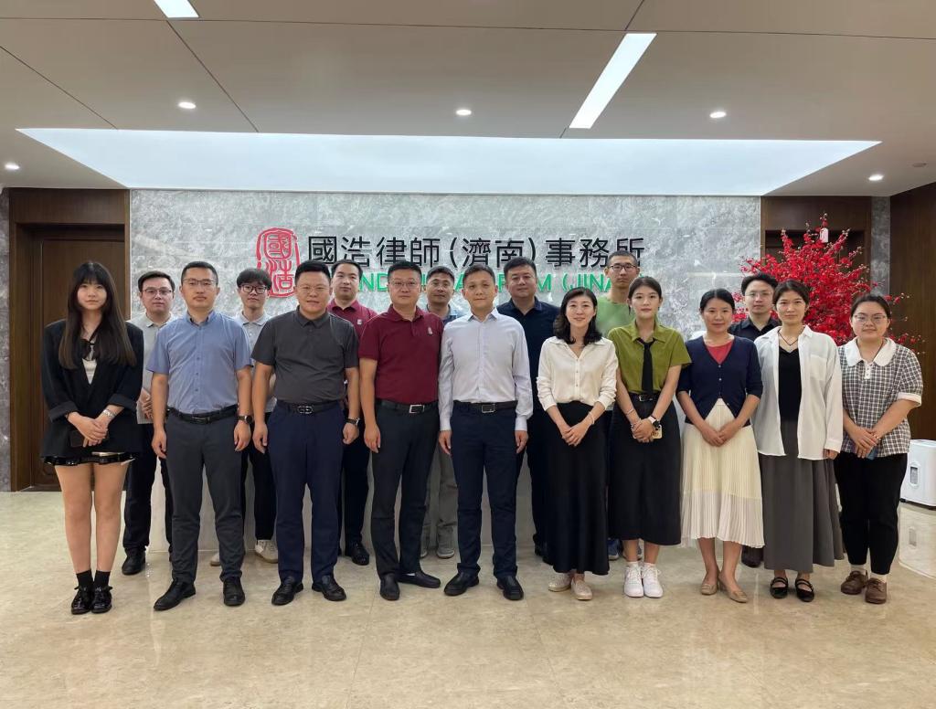 2025年9月5日下午,山东财经大学法学院党委副书记沙林斌、团委书记郭蕾、2023级辅导员杨玉霜、2022级辅导员殷浩松一行赴国浩律师(济南)事务所开展访企拓岗专项活动。国浩律师(济南)事务所合伙人杜万军、杨凯、沈光耀等热情接待并参与座谈,双方围绕学生实习实践、产学研融合、校友会筹备情况等议题展开深入交流。