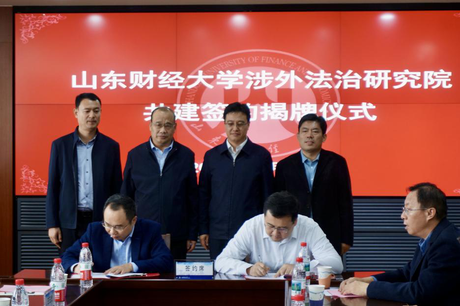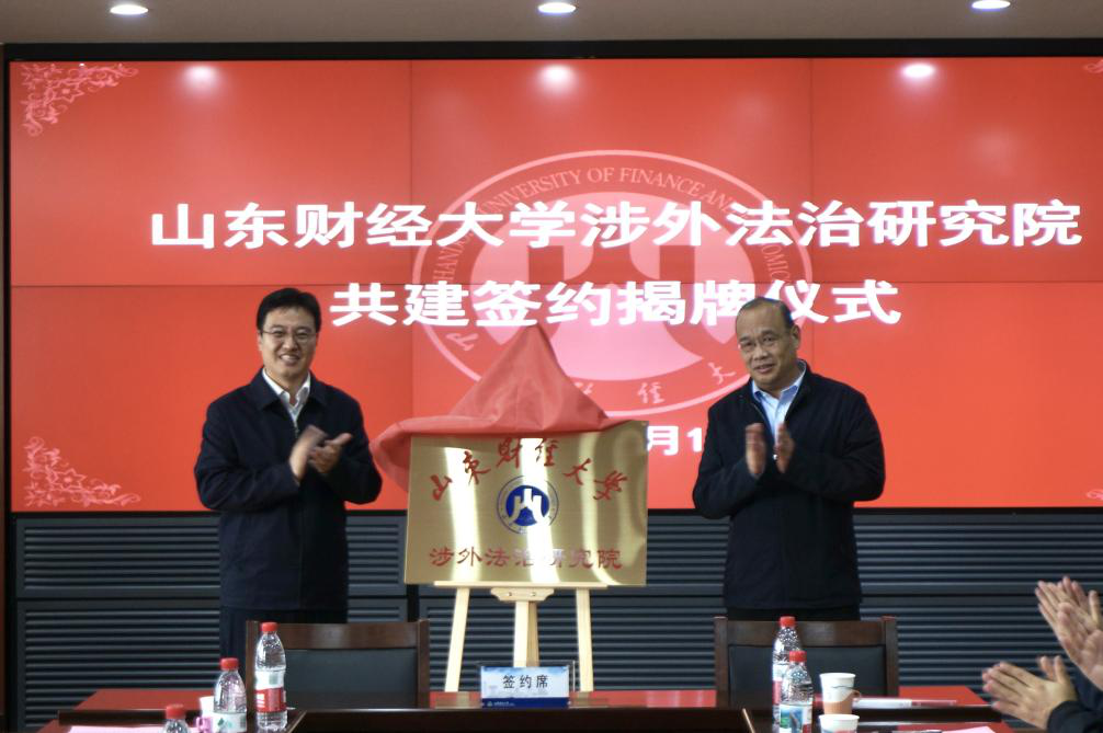 随后,座谈会议进入签约仪式阶段。法学院院长张琳、济南高新部部长段连文作为代表签署《山东财经大学涉外法治研究院共建合作协议书》,这标志着涉外法治研究院“产学研”深度融合的崭新篇章正式开启。在热烈的掌声中,张培国、苏卫东为“山东财经大学涉外法治研究院”揭牌。