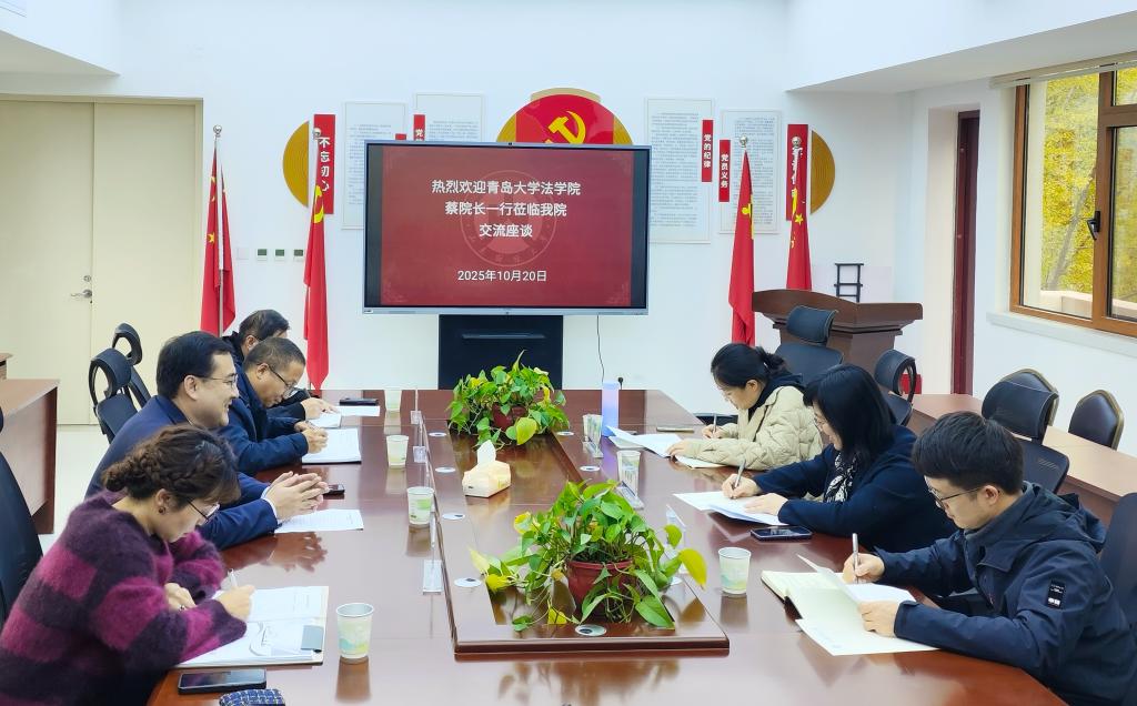10月20日上午,青岛大学法学院院长蔡颖雯、院长助理周颖、黄军一行到访我院。学院院长张琳,副院长王莉莉、王仰光,涉外法治研究院副院长李同武会见了代表团一行,并举行了交流座谈。