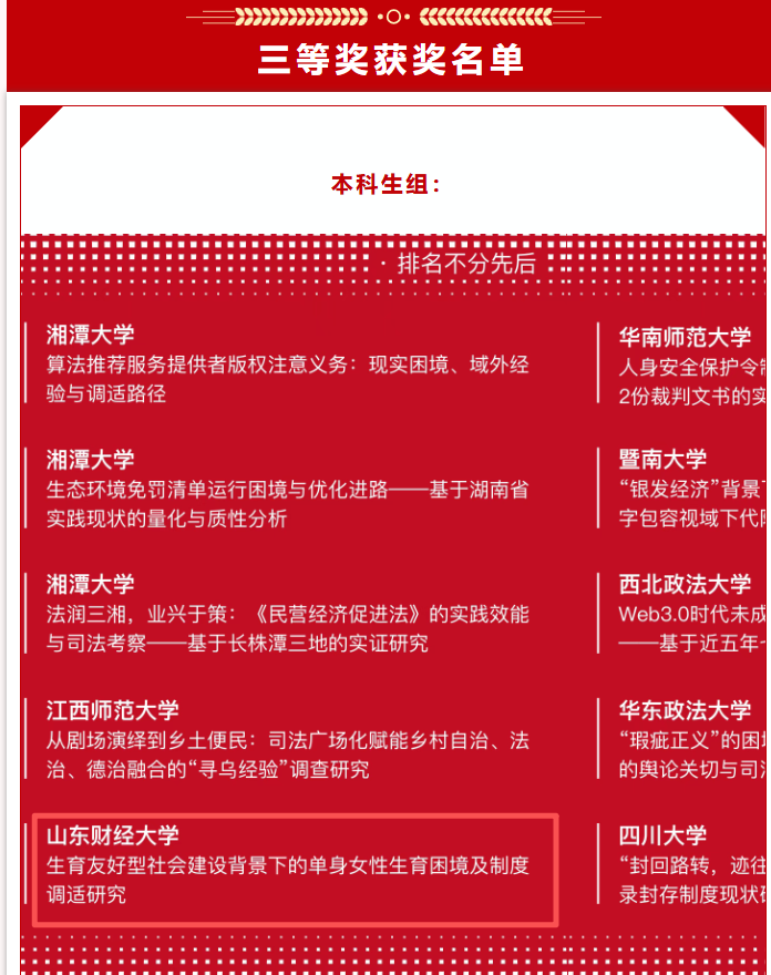 10月19日,由华东政法大学主办,华东政法大学社会发展学院、法与社会研究中心、社会调查研究所联合承办的“从法杯”全国大学生“法治中国”调研大赛获奖名单正式揭晓。我院本科生团队首次参赛便崭露头角,凭借扎实的调研功底与严谨的学术表达,荣获本科生组全国三等奖。