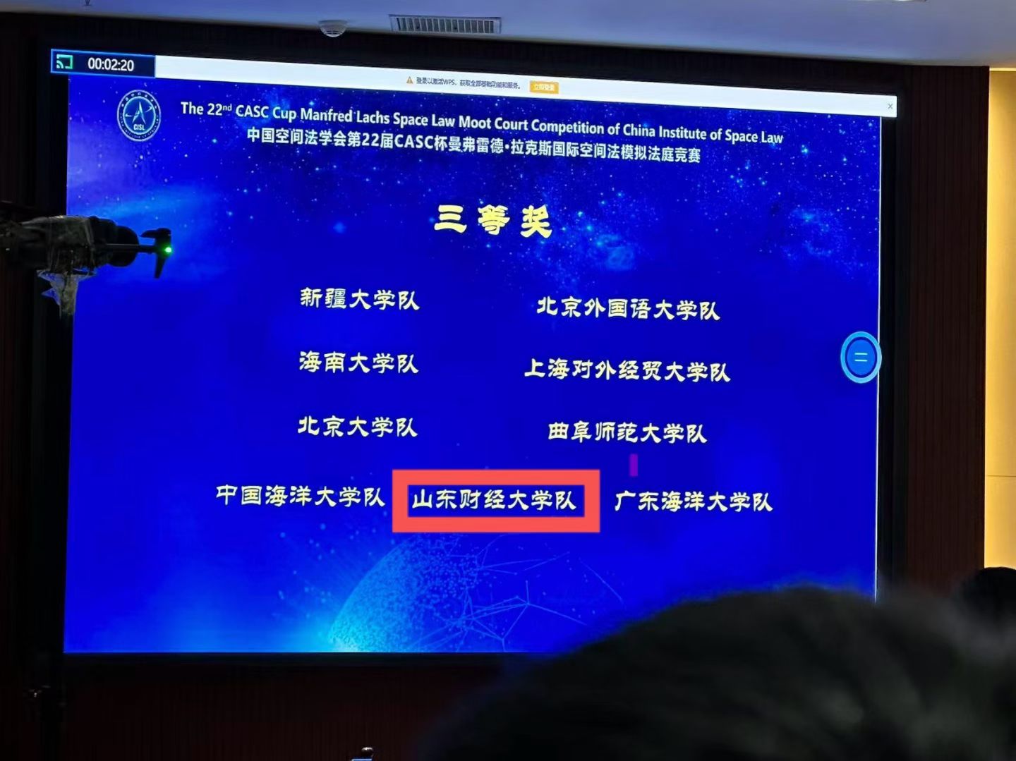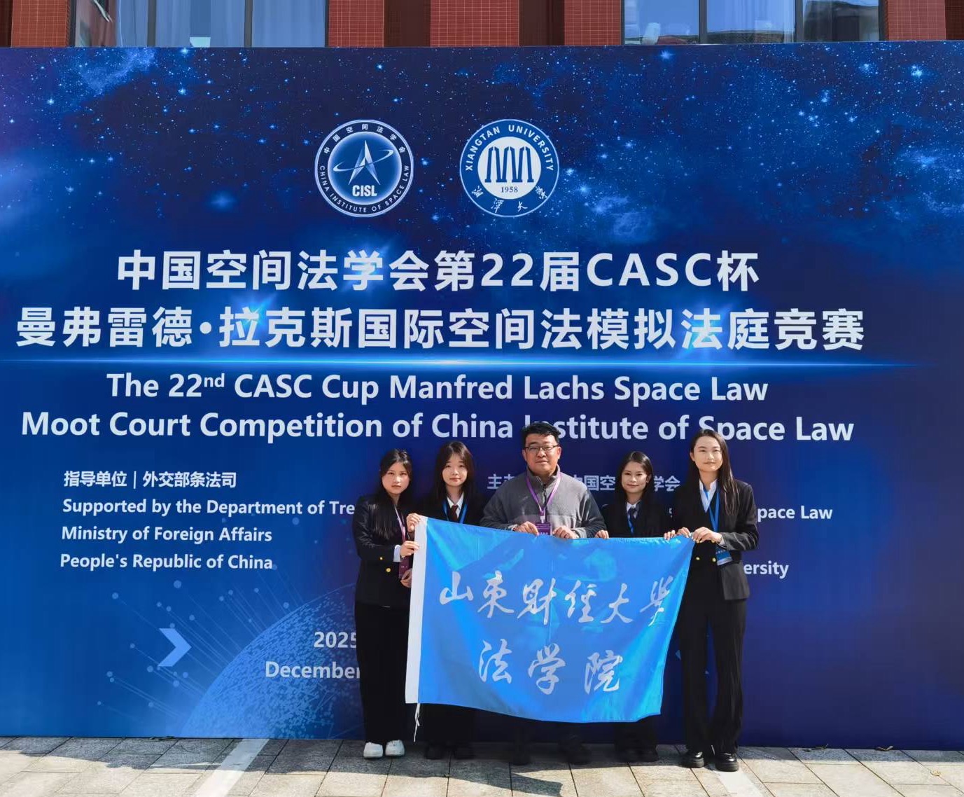 近日,中国空间法学会第22届曼弗雷德·拉克斯CASC杯国际空间法模拟法庭竞赛在湖南省湘潭市湘潭大学圆满落幕。本届赛事作为国际空间法学会Manfred Lachs国际空间法模拟法庭竞赛体系的重要组成部分,吸引了全国35所高校的队伍参赛,最终24支队伍晋级口头辩论环节。山东财经大学法学院代表队凭借扎实的专业功底与出色的赛场表现,斩获国家三等奖,展现了我校涉外法治人才培养的丰硕成果。