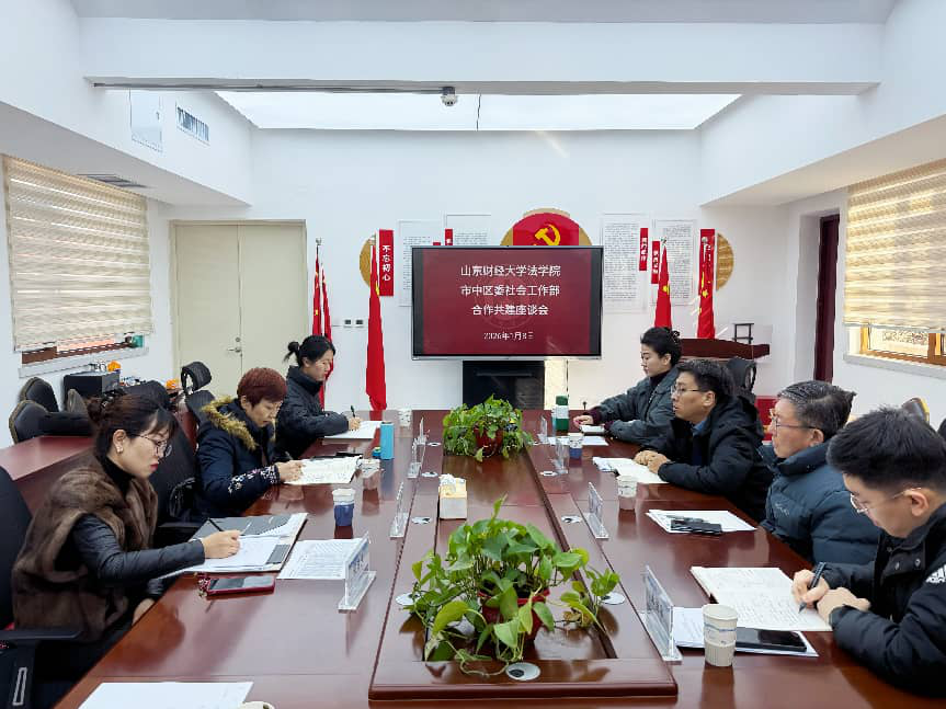 为探索社会工作人才培养新模式,推动理论研究与专业实践深度融合,2026年1月8日,山东财经大学法学院与市中区委社会工作部合作共建座谈会在法学院325会议室举行,市中区委社会工作部副部长解鹏、副部长郭林等社工部代表一行五人来院开展合作交流。会议由社会工作系主任董云芳教授主持,法学院副院长王莉莉、社会工作系教师代表共同与会。