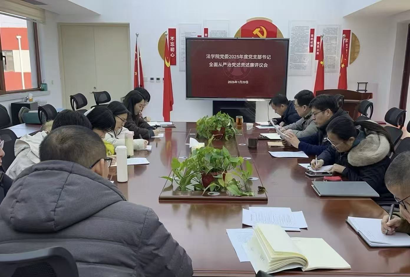 为深入学习贯彻习近平新时代中国特色社会主义思想和党的二十大、二十届历次全会精神,认真贯彻落实习近平总书记关于党的建设的重要思想、关于党的自我革命的重要思想,进一步压紧压实基层党组织书记全面从严治党第一责任人职责,1月20日上午,法学院党委在燕山校区6号楼325会议室召开了2025年度党支部书记全面从严治党述责述廉评议会。会议由党委书记刘洪主持,学院全体班子成员及全体支部书记参加会议。