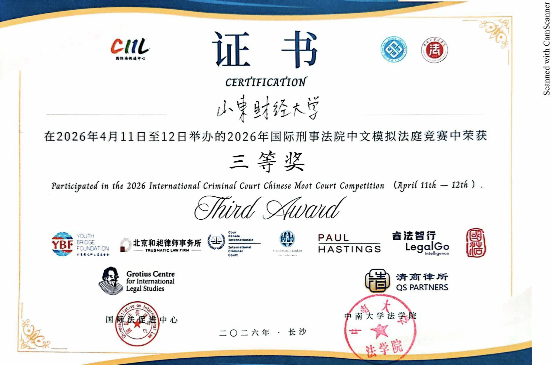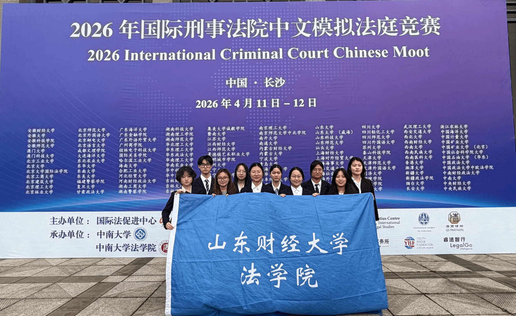 2026年4月10日至12日,2026年国际刑事法院中文模拟法庭竞赛在中南大学(潇湘校区)隆重举行。本节比赛吸引了130支高校代表队参赛,包括北京大学、清华大学、中国政法大学、吉林大学、中南财经政法大学等知名院校,参赛规模创历史新高。经过激烈角逐,山东财经大学代表队以优异成绩荣获全国三等奖。