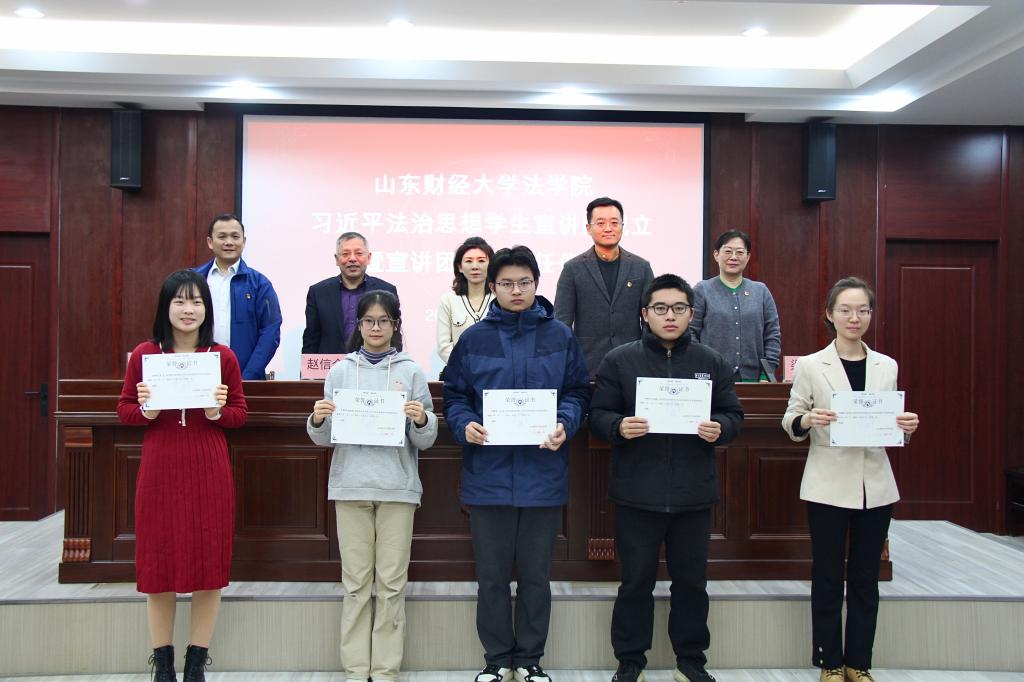 为全面贯彻习近平新时代中国特色社会主义思想,深入学习宣传习近平法治思想,1月4日上午,法学院在燕山校区4号教学楼模拟法庭举行习近平法治思想学生宣讲团成立仪式暨宣讲团成员聘任仪式。学校团委书记王晓迪、法学院党委书记危红、院长赵信会、教师代表梁晓俭教授及学生宣讲团成员等出席成立仪式。仪式由法学院党委副书记沙林斌主持。
