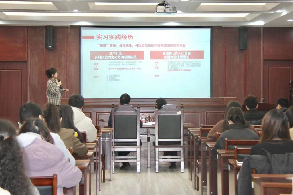 本届职业规划大赛分为就业赛道和成长赛道,经过初赛评比有50名同学进入复赛。成长赛道面向我院本科一、二、三年级的学生,考查同学们职业发展规划的科学性和围绕实现职业目标的成长过程。就业赛道面向我院本科三、四年级学生和全体研究生,主要考察同学们求职的实战能力,个人发展路径与经济社会发展需要的适应度,就业能力与职业目标和岗位要求的契合度。现场每位参赛选手有五分钟的自我陈述时间,评委进行时长为三分钟的提问。参赛选手按照抽签顺序依次上台展示。