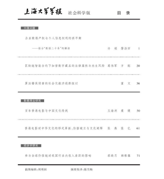 法学院董文副教授在《上海大学学报(社会科学版)》2023年第2期发表论文《算法错误侵害的社会化救济进路探讨》。《上海大学学报(社会科学版)》是教育部名栏工程入选期刊、中文社会科学引文索引(CSSCI)来源期刊、全国中文核心期刊、中国人文社会科学核心期刊、全国高效社科名刊,由上海市教育委员会主管、上海大学主办。
