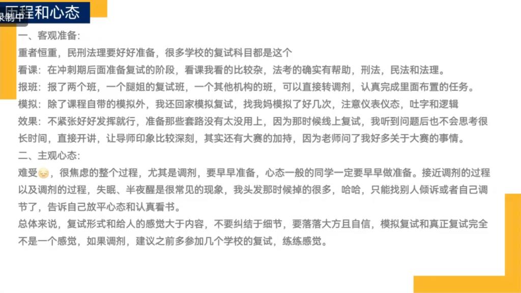 分享会上三位校友先后分享了自己在院校选择、复试注意事项、调剂流程和心态等方面的经验。姜荷结合自己调剂辽宁大学学硕经济法专业的经验告诉同学们,只要有机会就要优先准备第一志愿的复试,而调剂复试在形式、内容上可能都和以一志愿学校不同,要尽早准备,调剂时尽量不要跨专业调剂,难度太大。许雅琳着重强调了调剂院校的选择和准备复试过程中的心态调整,提醒同学们要提前做好充分心理准备。宋书瑶分别从客观准备和主观心态两方面分享了自己的复试历程和体验,详细介绍了调剂系统的操作和注意事项。最后,三位校友耐心地解答了同学们的在线提问。